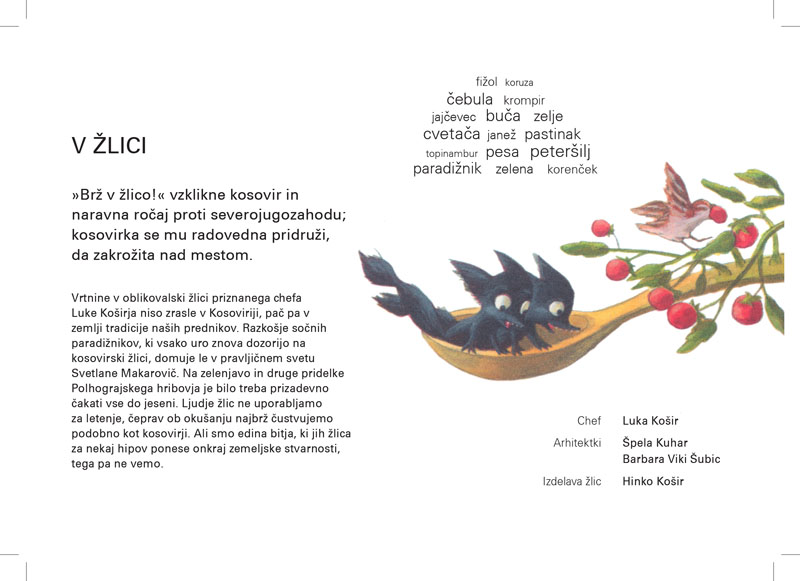 Vrtnine v oblikovalski žlici priznanega chefa Luke Koširja niso zrasle v Kosoviriji, pač pa v zemlji tradicije naših prednikov. Razkošje sočnih paradižnikov, ki vsako uro znova dozorijo na kosovirski žlici, domuje le v pravljičnem svetu Svetlane Makarovič. Na zelenjavo in druge pridelke Polhograjskega hribovja je bilo treba prizadevno čakati vse do jeseni. Ljudje žlic ne uporabljamo za letenje, čeprav ob okušanju najbrž čustvujemo podobno kot kosovirji. Ali smo edina bitja, ki jih žlica za nekaj hipov ponese onkraj zemeljske stvarnosti, tega pa ne vemo.